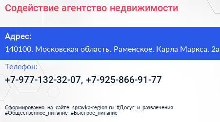 Содействие, агентство недвижимости по адресу 140100, Московская область, Раменское, Карла Маркса, 2а в дальнейшем Организация, размещена в следующих категориях: