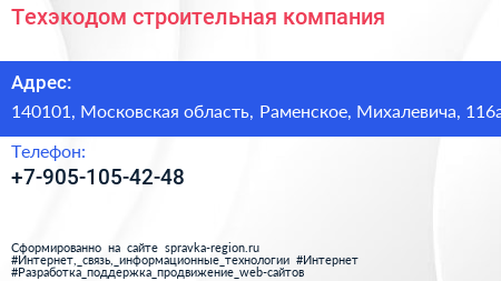 Техэкодом, строительная компания по адресу 140101, Московская область, Раменское, Михалевича, 116а в дальнейшем Организация, размещена в следующих категориях: