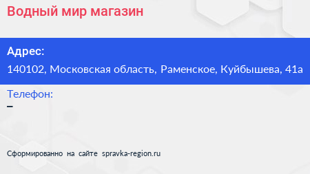 Водный мир, магазин по адресу 140102, Московская область, Раменское, Куйбышева, 41а в дальнейшем Организация, размещена в следующих категориях: