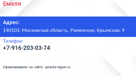 Емеля по адресу 140103, Московская область, Раменское, Крымская, 9 в дальнейшем Организация, размещена в следующих категориях: