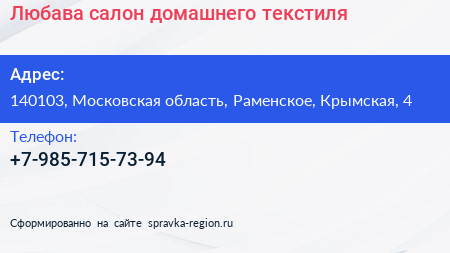 Любава, салон домашнего текстиля по адресу 140103, Московская область, Раменское, Крымская, 4 в дальнейшем Организация, размещена в следующих категориях: