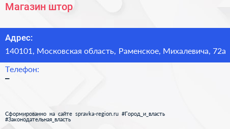 Магазин штор по адресу 140101, Московская область, Раменское, Михалевича, 72а в дальнейшем Организация, размещена в следующих категориях: