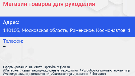 Магазин товаров для рукоделия по адресу 140105, Московская область, Раменское, Космонавтов, 1 в дальнейшем Организация, размещена в следующих категориях: