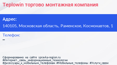 Teplowin, торгово-монтажная компания по адресу 140105, Московская область, Раменское, Космонавтов, 1 в дальнейшем Организация, размещена в следующих категориях: