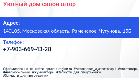 Уютный дом, салон штор по адресу 140105, Московская область, Раменское, Чугунова, 15Б в дальнейшем Организация, размещена в следующих категориях: