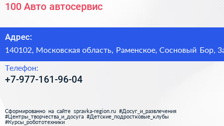 100 Авто, автосервис по адресу 140102, Московская область, Раменское, Сосновый Бор, 3а в дальнейшем Организация, размещена в следующих категориях:
