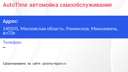 AutoTime, автомойка самообслуживания по адресу 140101, Московская область, Раменское, Михалевича, вл72е в дальнейшем Организация, размещена в следующих категориях: