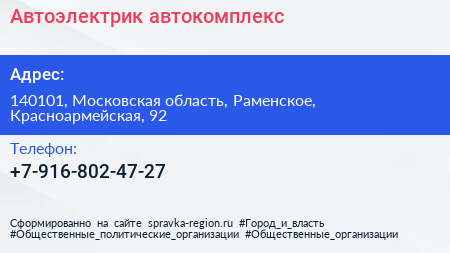 Автоэлектрик, автокомплекс по адресу 140101, Московская область, Раменское, Красноармейская, 92 в дальнейшем Организация, размещена в следующих категориях: