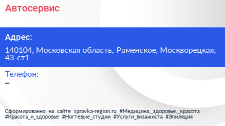Автосервис по адресу 140104, Московская область, Раменское, Москворецкая, 43 ст1 в дальнейшем Организация, размещена в следующих категориях: