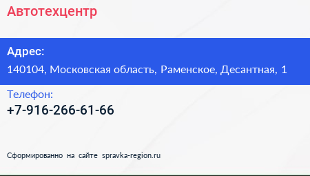 Автотехцентр по адресу 140104, Московская область, Раменское, Десантная, 1 в дальнейшем Организация, размещена в следующих категориях: