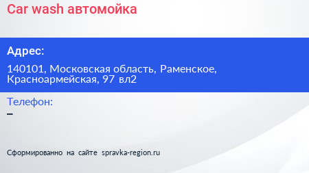 Car wash, автомойка по адресу 140101, Московская область, Раменское, Красноармейская, 97 вл2 в дальнейшем Организация, размещена в следующих категориях: