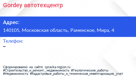 Gordey, автотехцентр по адресу 140105, Московская область, Раменское, Мира, 4 в дальнейшем Организация, размещена в следующих категориях: