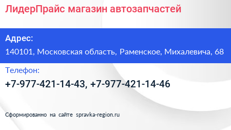 ЛидерПрайс, магазин автозапчастей по адресу 140101, Московская область, Раменское, Михалевича, 68 в дальнейшем Организация, размещена в следующих категориях: