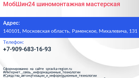 МобШин24, шиномонтажная мастерская по адресу 140101, Московская область, Раменское, Михалевича, 131 в дальнейшем Организация, размещена в следующих категориях: