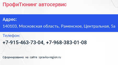 ПрофиТюнинг, автосервис по адресу 140103, Московская область, Раменское, Центральная, 5а в дальнейшем Организация, размещена в следующих категориях: