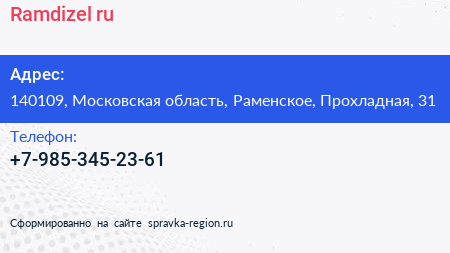 Ramdizel.ru по адресу 140109, Московская область, Раменское, Прохладная, 31 в дальнейшем Организация, размещена в следующих категориях: