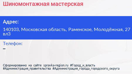 Шиномонтажная мастерская по адресу 140103, Московская область, Раменское, Молодёжная, 27 вл3 в дальнейшем Организация, размещена в следующих категориях: