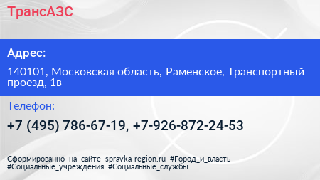 ТрансАЗС по адресу 140101, Московская область, Раменское, Транспортный проезд, 1в в дальнейшем Организация, размещена в следующих категориях: