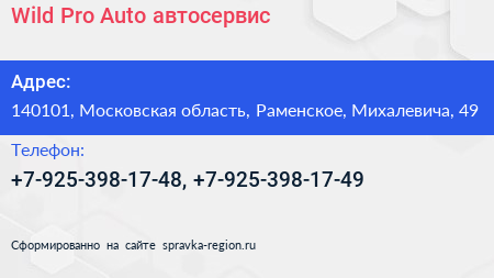 Wild Pro Auto, автосервис по адресу 140101, Московская область, Раменское, Михалевича, 49 в дальнейшем Организация, размещена в следующих категориях: