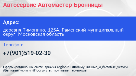 Автосервис «Автомастер Бронницы» по адресу деревня Тимонино, 125А, Раменский муниципальный округ, Московская область в дальнейшем Организация, размещена в следующих категориях: