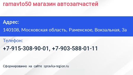 ramavto50, магазин автозапчастей по адресу 140108, Московская область, Раменское, Вокзальная, 3а в дальнейшем Организация, размещена в следующих категориях: