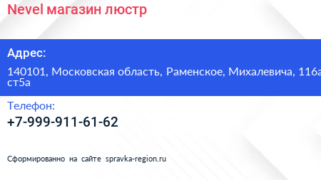 Nevel, магазин люстр по адресу 140101, Московская область, Раменское, Михалевича, 116а ст5а в дальнейшем Организация, размещена в следующих категориях: