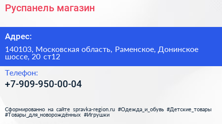 Руспанель, магазин по адресу 140103, Московская область, Раменское, Донинское шоссе, 20 ст12 в дальнейшем Организация, размещена в следующих категориях:
