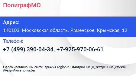 ПолиграфМО по адресу 140103, Московская область, Раменское, Крымская, 12 в дальнейшем Организация, размещена в следующих категориях: