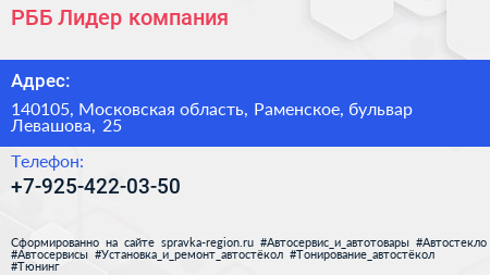 РББ Лидер, компания по адресу 140105, Московская область, Раменское, бульвар Левашова, 25 в дальнейшем Организация, размещена в следующих категориях: