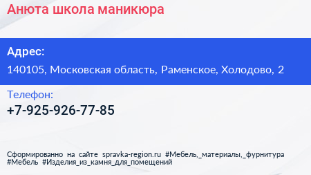 Анюта, школа маникюра по адресу 140105, Московская область, Раменское, Холодово, 2 в дальнейшем Организация, размещена в следующих категориях: