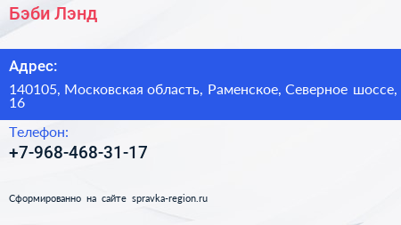 Бэби-Лэнд по адресу 140105, Московская область, Раменское, Северное шоссе, 16 в дальнейшем Организация, размещена в следующих категориях: