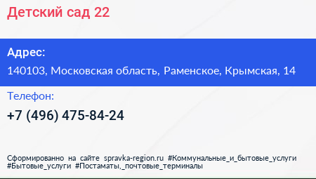 Детский сад №22 по адресу 140103, Московская область, Раменское, Крымская, 14 в дальнейшем Организация, размещена в следующих категориях: