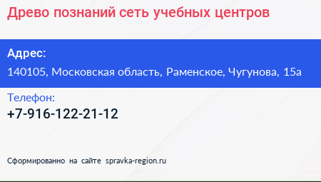 Древо познаний, сеть учебных центров по адресу 140105, Московская область, Раменское, Чугунова, 15а в дальнейшем Организация, размещена в следующих категориях: