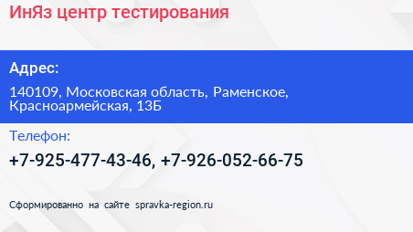 ИнЯз, центр тестирования по адресу 140109, Московская область, Раменское, Красноармейская, 13Б в дальнейшем Организация, размещена в следующих категориях: