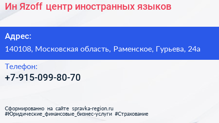 Ин.Яzоff, центр иностранных языков по адресу 140108, Московская область, Раменское, Гурьева, 24а в дальнейшем Организация, размещена в следующих категориях: