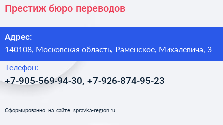 Престиж, бюро переводов по адресу 140108, Московская область, Раменское, Михалевича, 3 в дальнейшем Организация, размещена в следующих категориях: