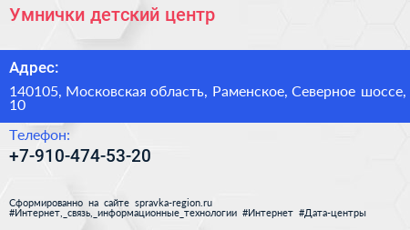 Умнички, детский центр по адресу 140105, Московская область, Раменское, Северное шоссе, 10 в дальнейшем Организация, размещена в следующих категориях: