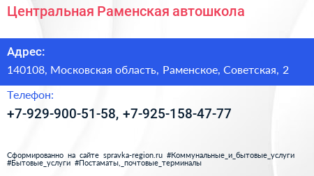 Центральная Раменская автошкола по адресу 140108, Московская область, Раменское, Советская, 2 в дальнейшем Организация, размещена в следующих категориях: