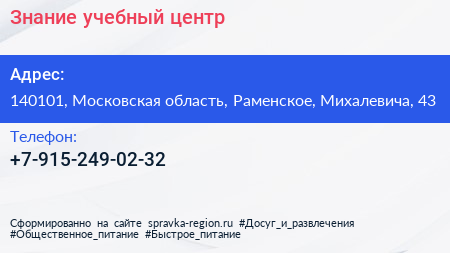 Знание, учебный центр по адресу 140101, Московская область, Раменское, Михалевича, 43 в дальнейшем Организация, размещена в следующих категориях: