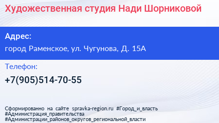 Художественная студия Нади Шорниковой по адресу город Раменское, ул. Чугунова, Д. 15А в дальнейшем Организация, размещена в следующих категориях: