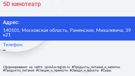 5D-кинотеатр по адресу 140101, Московская область, Раменское, Михалевича, 39 к21 в дальнейшем Организация, размещена в следующих категориях: