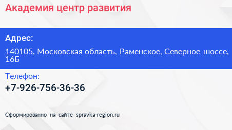 Академия, центр развития по адресу 140105, Московская область, Раменское, Северное шоссе, 16Б в дальнейшем Организация, размещена в следующих категориях: