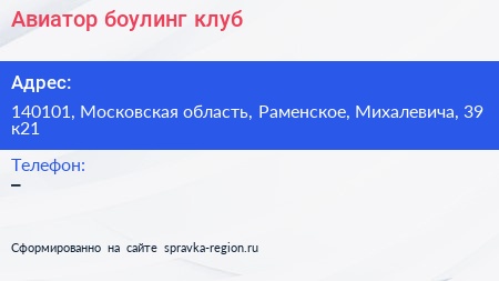 Авиатор, боулинг-клуб по адресу 140101, Московская область, Раменское, Михалевича, 39 к21 в дальнейшем Организация, размещена в следующих категориях: