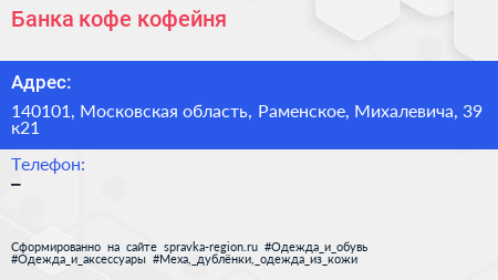 Банка кофе, кофейня по адресу 140101, Московская область, Раменское, Михалевича, 39 к21 в дальнейшем Организация, размещена в следующих категориях: