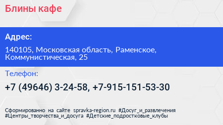 Блины, кафе по адресу 140105, Московская область, Раменское, Коммунистическая, 25 в дальнейшем Организация, размещена в следующих категориях: