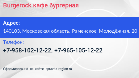 Burgerock, кафе-бургерная по адресу 140103, Московская область, Раменское, Молодёжная, 20 в дальнейшем Организация, размещена в следующих категориях: