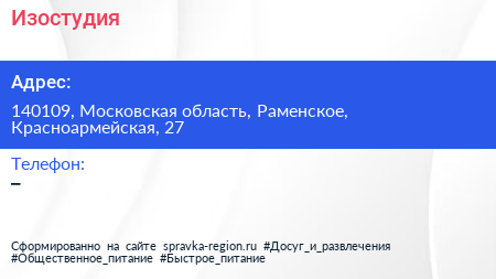 Изостудия по адресу 140109, Московская область, Раменское, Красноармейская, 27 в дальнейшем Организация, размещена в следующих категориях: