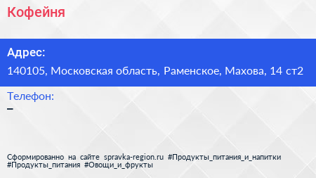 Кофейня по адресу 140105, Московская область, Раменское, Махова, 14 ст2 в дальнейшем Организация, размещена в следующих категориях:
