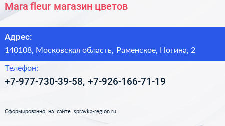 Mara fleur, магазин цветов по адресу 140108, Московская область, Раменское, Ногина, 2 в дальнейшем Организация, размещена в следующих категориях: