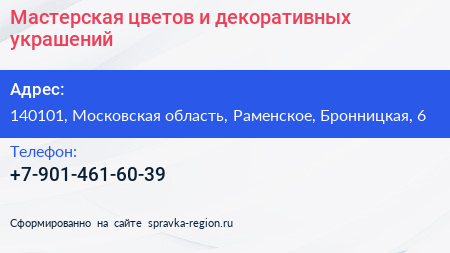 Мастерская цветов и декоративных украшений по адресу 140101, Московская область, Раменское, Бронницкая, 6 в дальнейшем Организация, размещена в следующих категориях: